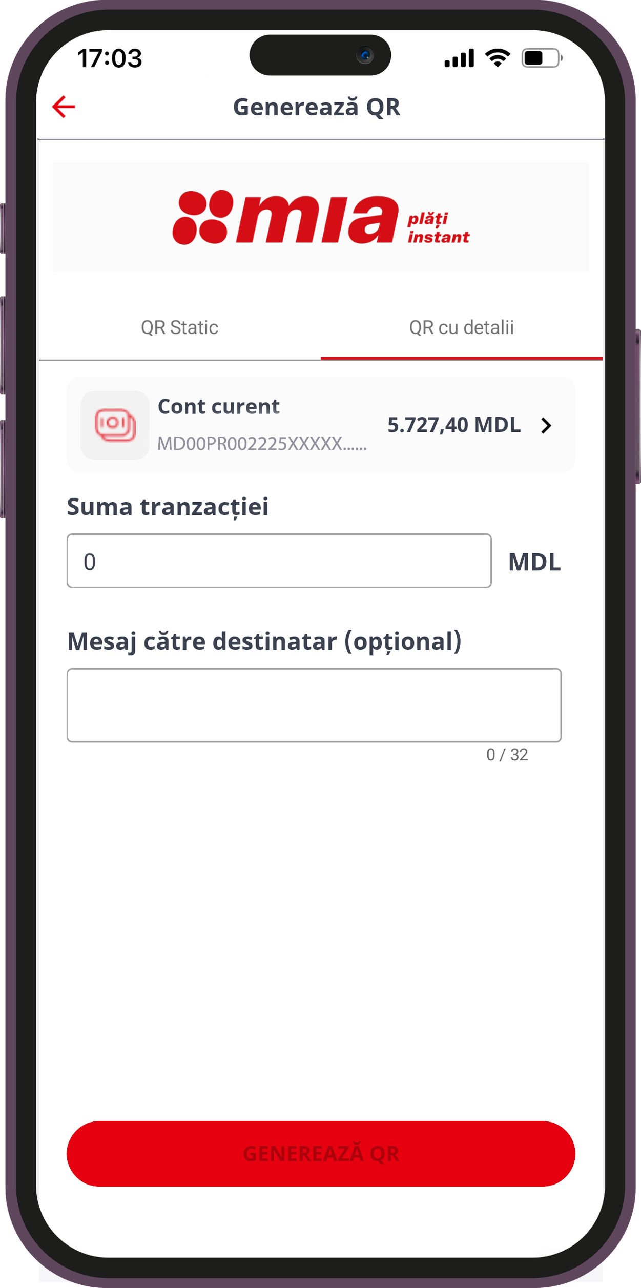 2. Prin QR code dinamic (cu detalii) - cu această opțiune, poate fi solicitată o sumă fixă din partea expeditorului, în limita tranzacțiilor posibile.
