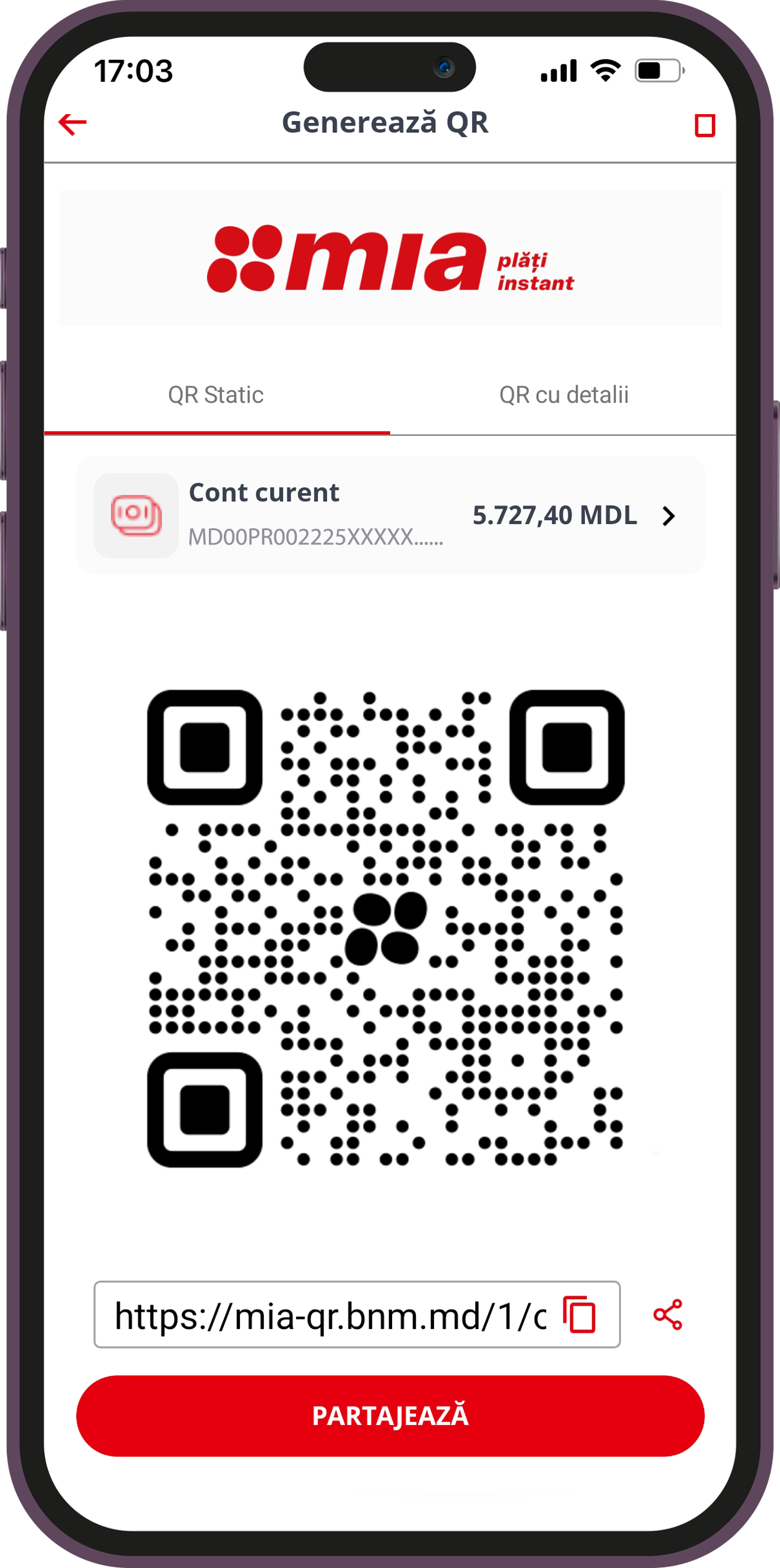 Pe lângă asta, de pe pagina QR code-ului static poate fi copiat sau distribuit link-ul generat automat, care poate fi transmis către expeditor prin mail sau o aplicație messenger. Și în acest caz, va putea fi expediată orice sumă, în limita tranzacțiilor disponibile.