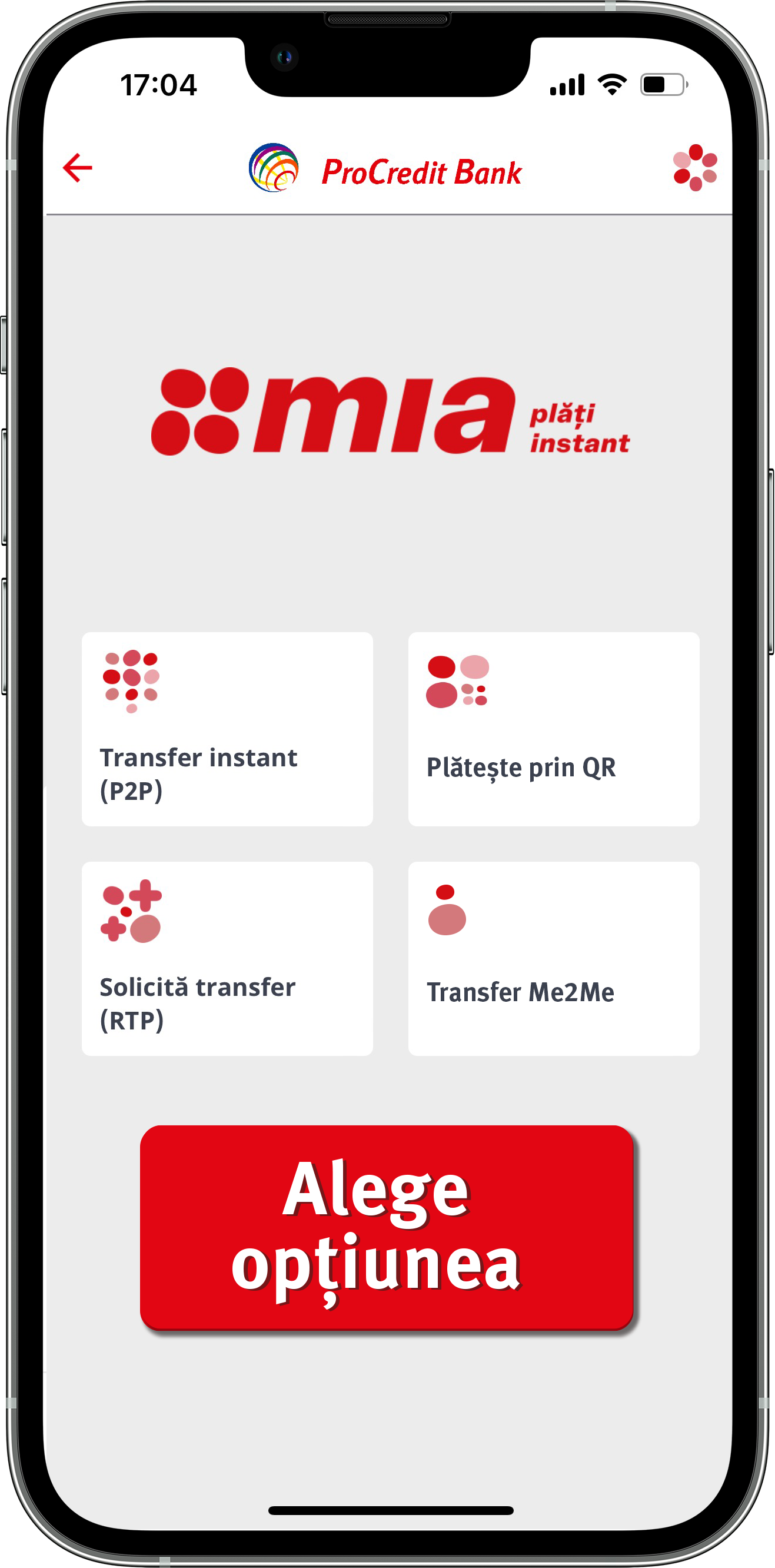 ATENȚIE: Pentru a putea utiliza noile opțiuni MIA, este necesar să actualizați aplicația mobilă ProCredit Bank Moldova din Google Play sau App Store.