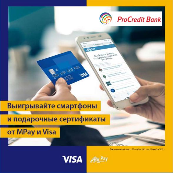 А с картой Visa от ProCredit Bank вы можете еще и проверить удачу и выиграть смартфон или подарочные сертификаты. Просто выбирайте услугу, оплачивайте ее на сайте mpay.gov.md, указывайте Ваш номер телефона и участвуйте в розыгрыше призов.
