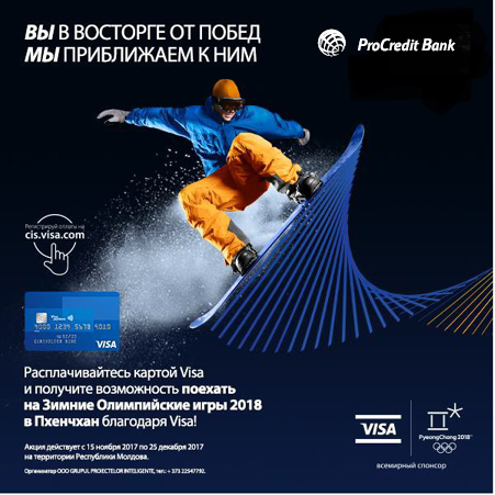 Для участия в розыгрыше одной поездки на двоих на Зимние Олимпийские игры 2018 в Пхенчхане расплачивайтесь картой Visa от ProCredit Bank и регистрируйте ваши чеки или онлайн-оплаты с 15 ноября 2017 до 27 декабря 2017 на cis.visa.com.